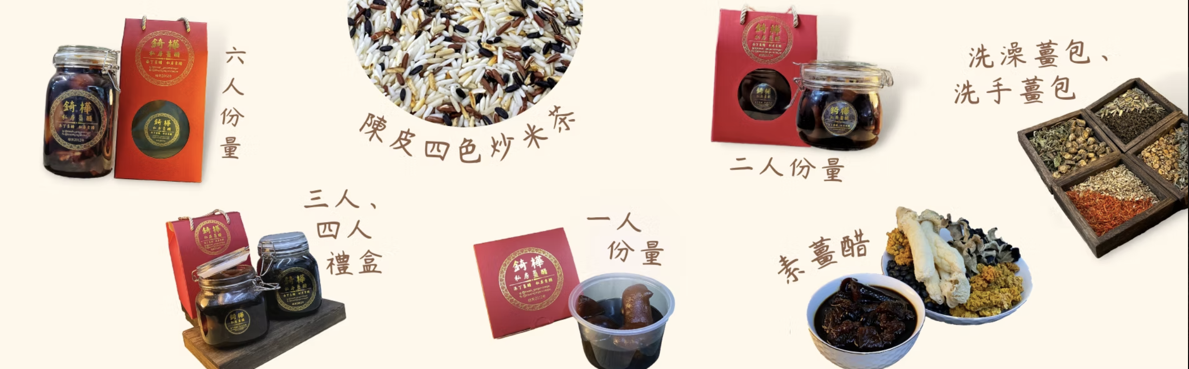 主要業務是製作優質薑醋(自用或 送禮包裝)、祛風洗澡及洗手薑包, 陳皮炒米茶等食療/產後用品。